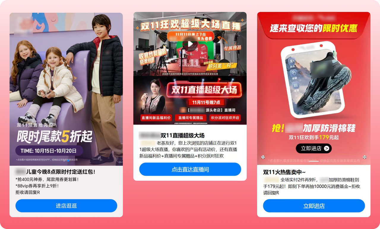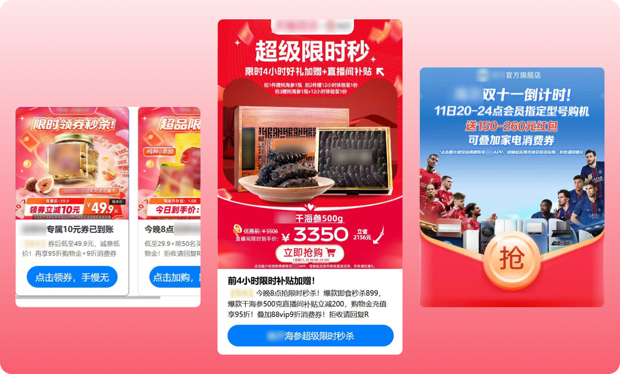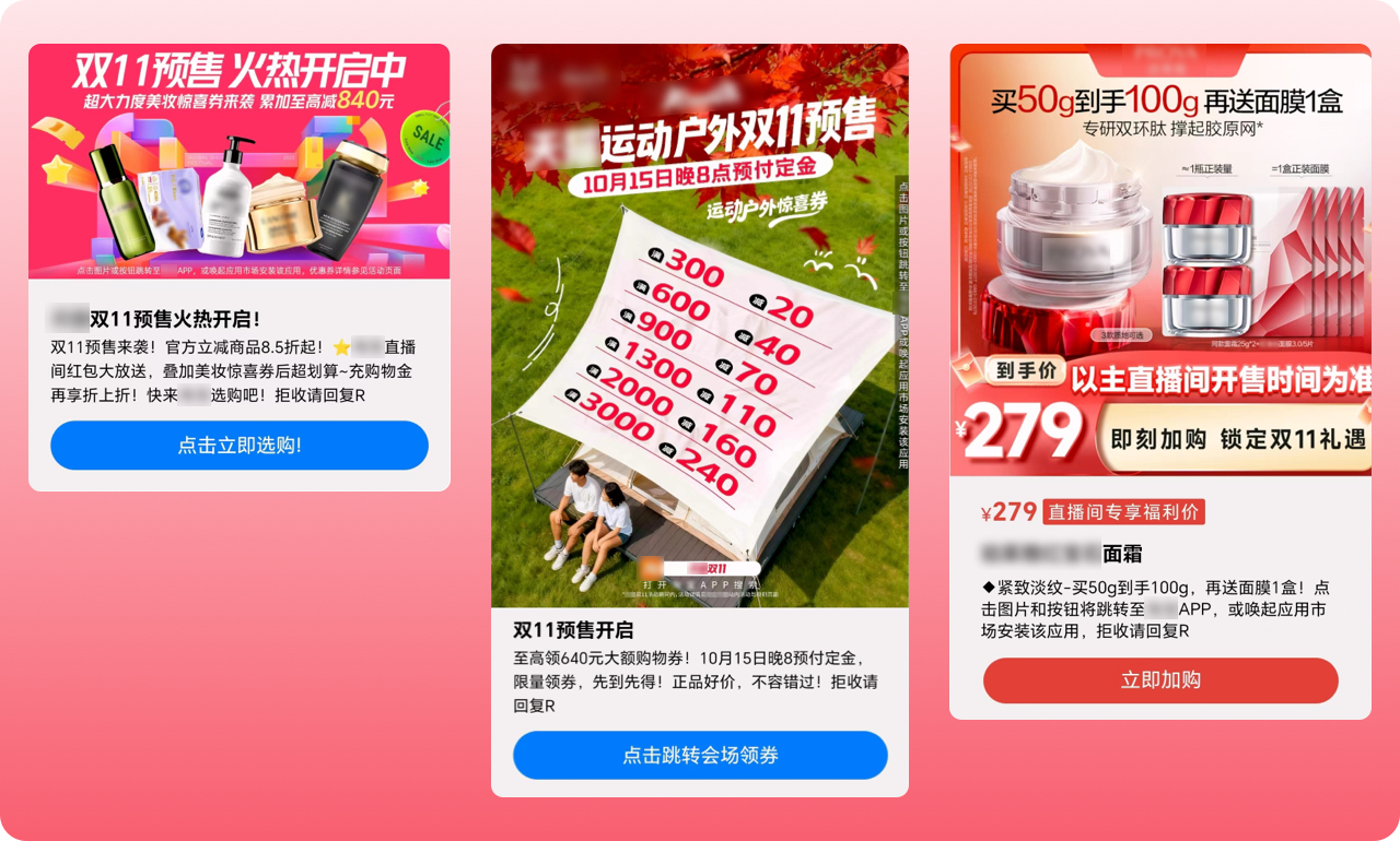 針對家電、數(shù)碼等高價功能性品類,品牌商家通過5G閱信富媒體功能向用戶推送直播信息、搶購入口,吸引用戶參與互動。如定制“倒計時卡片”,在富媒體消息頁面展示 “限量商品,搶購進(jìn)行中”,激勵用戶點擊直接跳轉(zhuǎn)淘寶直播間,無需登錄即領(lǐng)專屬優(yōu)惠券。倒計時、限時折扣等營銷手段營造緊張購物氛圍,促使用戶盡快下單,將猶豫轉(zhuǎn)化為沖動購買。其精準(zhǔn)推送功能確保消費者喜好與需求高度匹配,同時簡化購物流程,一鍵直達(dá)功能也減少了用戶在不同頁面之間切換的繁瑣步驟,降低了用戶流失率。