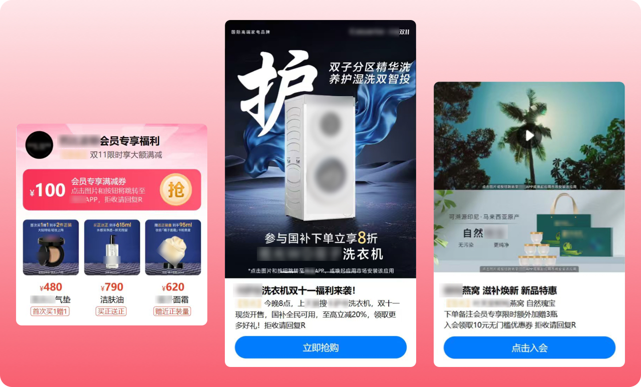 針對消費新現(xiàn)象,品牌商家簡化玩法,從“搶增量”向“挖存量”轉(zhuǎn)變,真正做到精細(xì)化運營。雙十一期間,不同場景下消費者的購物行為和需求有所不同,商家針對不同群體消費心理動線、場景和時間節(jié)點采取差異化、有側(cè)重的營銷策略,通過夢網(wǎng)科技5G富媒體消息解決方案“富媒體+高覆蓋+強觸達(dá)”優(yōu)勢,打通雙十一營銷中各群體“需求萌發(fā)-種草興趣-決策猶豫-購買轉(zhuǎn)化”的全場景全鏈路消費過程,贏得雙十一大促。