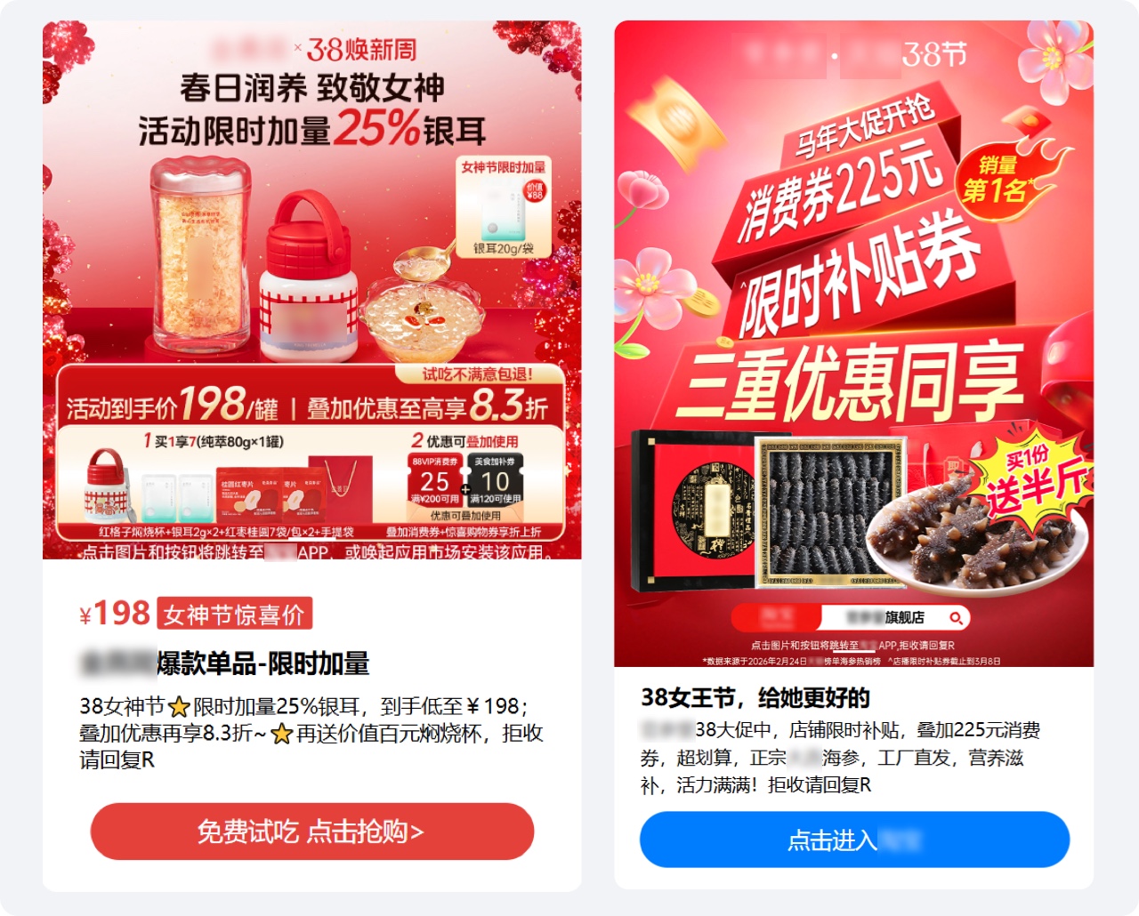 在電商領(lǐng)域,某滋補品品牌在38煥新周期間推出試吃搶購活動,頂部主視覺展示產(chǎn)品實物,中部標注價格錨點與疊加優(yōu)惠,底部“免費試吃 點擊搶購”按鈕直接喚起購物App。整個消費鏈路從“看到”到“買到”被壓縮至三步以內(nèi),相較傳統(tǒng)短信“打開-復(fù)制鏈接-跳轉(zhuǎn)瀏覽器-打開App-搜索商品”的五步流程,轉(zhuǎn)化效率有所提高。